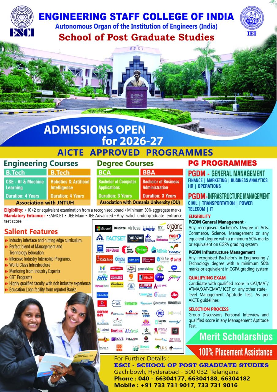 Engineering Staff College of India (ESCI) is a unique institution which deals with professional development of engineers and executives. It was set up in October 1981 by the premier body of professional engineers of India, The Institution of Engineers (India). One of the important divisions of ESCI is School of Post Graduate Studies, doing a yeomen service to the nation in its own right.